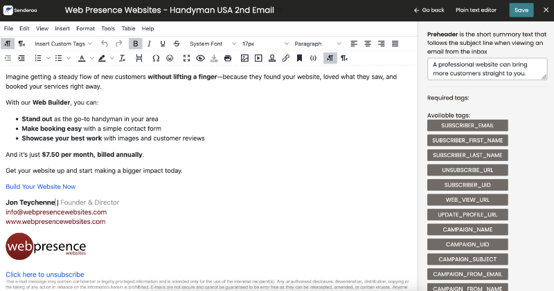 Take the manual work out of email marketing with Senderoo’s powerful automation tools. Set up drip campaigns, schedule broadcasts, and trigger emails based on customer behavior—all without lifting a finger. Whether you're nurturing leads, sending follow-ups, or automating customer onboarding, our intuitive platform ensures that your emails reach the right people at the right time. Focus on growing your business while Senderoo handles the rest.