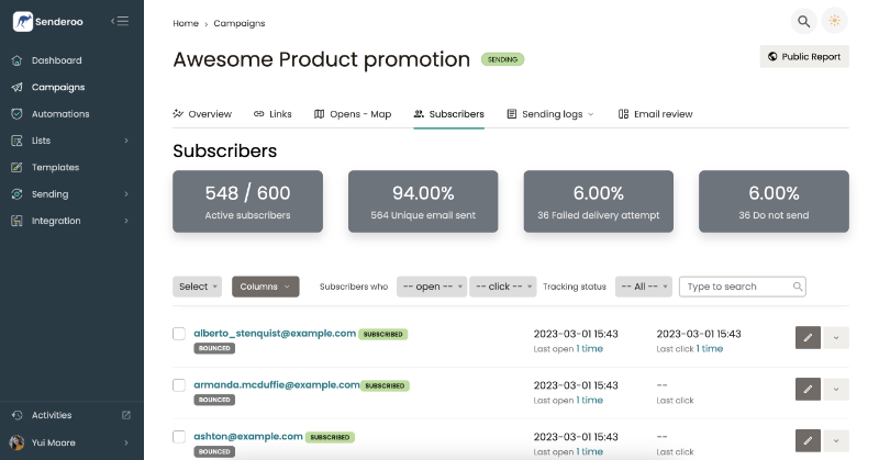 Monitor email opens, clicks, and engagement in real time. Automatically manage bounces and feedback, ensuring optimal deliverability. Gain valuable insights with detailed reports to measure and improve campaign performance.